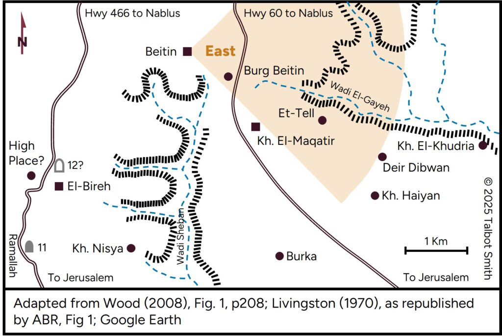 East of Bethel (Joshua 7:2) Yes. East of either option for Bethel Yes. East of el-Bira, marginally east of Beiten