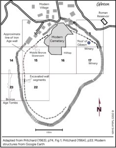 Gibeon turned out to be a challenging excavation, and contrary to established practice, Pritchard did not publish a stratification of the site. One of the specific challenges was that the summit of the mound had been badly disturbed by the digging of defensive trenches and by heavy shelling during the First World War. Also, a modern cemetery covers a large area near the top of the mound, preventing excavation of that area. In Pritchard’s words: