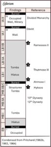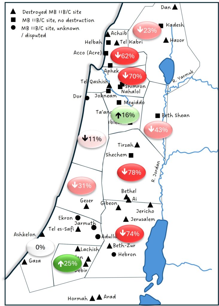 Archaeology is ultimately the study of material remains, of what is left behind by people and events. In this case, there are two things that we might consider: a change in the material culture, and evidence of the city destructions described in Joshua and in Judges 1. When archaeologists speak of material culture, they mean the pottery styles, the religious artifacts, and the architecture. Generally speaking, if an area were invaded by an alien group, we would expect to see a change in the material culture to reflect the culture of the newcomers. This was certainly the case with the arrival of the Philistines, who brought new pottery styles (what is known as “Philistine Ware”), new gods, and other influences. However, when we consider the arrival of the Israelites in Canaan, we need to be careful in assuming an associated change in the material culture. If we take the biblical account at face value, the Israelites lived in Canaan for over two hundred years, from the arrival of Abraham until Jacob’s descent into Egypt, and during that time they were “nomadic pastoralists”,[2] what today we might call Bedouin. As such, their material culture would have reflected that of their Canaanite neighbors. The next stop was Egypt. Manfred Bietak, the excavator of Avaris, described the pottery of those who departed at the time of our Theory One as “Egyptianized Canaanite”,[3] or Canaanite with Egyptian influences. Those who occupied Avaris prior to our Theory Two had a similar material culture. A later Exodus in line with Theory Three or Theory Four would have likely included many Canaanite slaves who might retain their original culture, depending on how long they had been in Egypt. In addition, we should consider that, according to Judges, the Israelites assimilated into Canaanite culture: