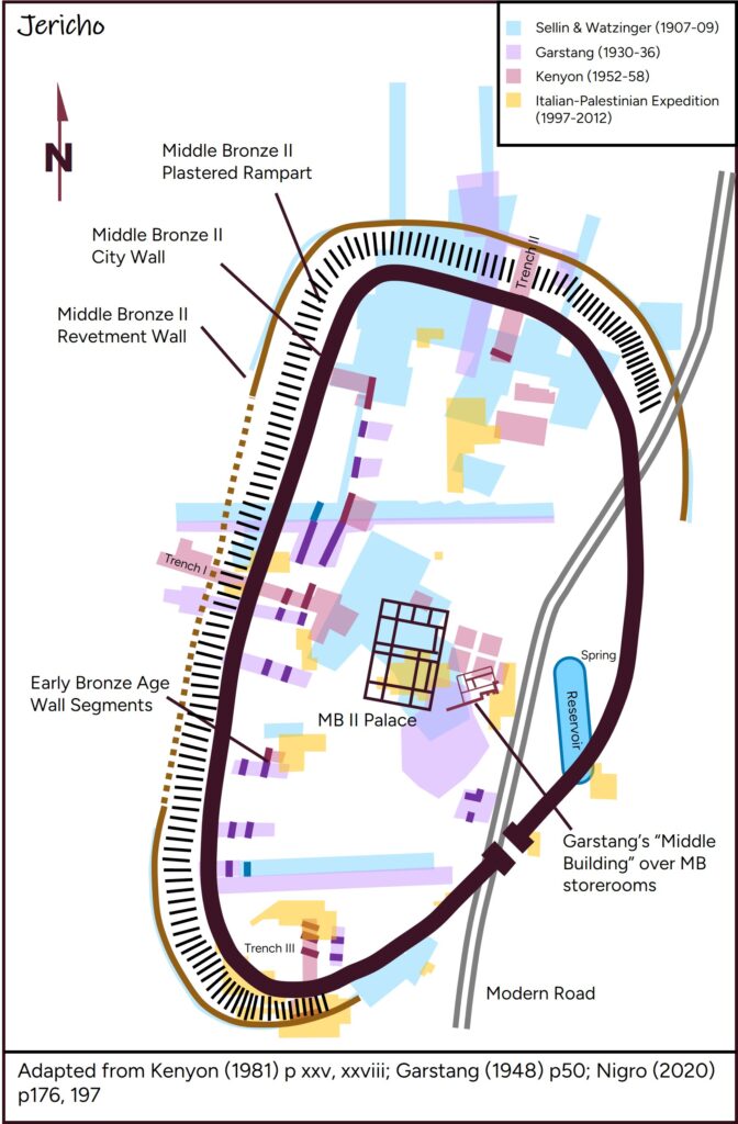 Jericho has been excavated extensively, first by the German team of Sellin and Watzinger from 1907-1909, followed by John Garstang from 1930-1936, Kathleen Kenyon from 1952-1958, and by a joint Italian-Palestinian team from 1997 to at least 2023 (see Figure 1). Garstang claimed to have identified a city that was destroyed at the end of Late Bronze I, consistent with our Theory Three. However, Garstang made several errors in his dating that were later corrected by Kenyon. With the completion of Kenyon’s work, and considering also the work of her predecessors, the picture of Jericho was as follows (see Figure 2):