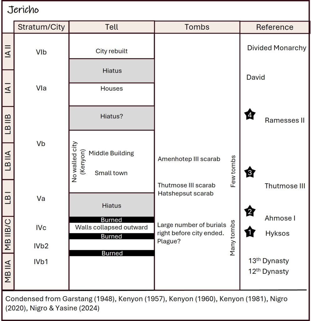 • While there was evidence of Late Bronze Age burials in Jericho’s tombs and some level of occupation on the tell, there was no walled city at Jericho during all of the Late Bronze Age. The volume of Late Bronze burials is tiny compared to that of the preceding Middle Bronze Age, suggestion a much smaller population or reuse of the tombs by the local nomadic population.