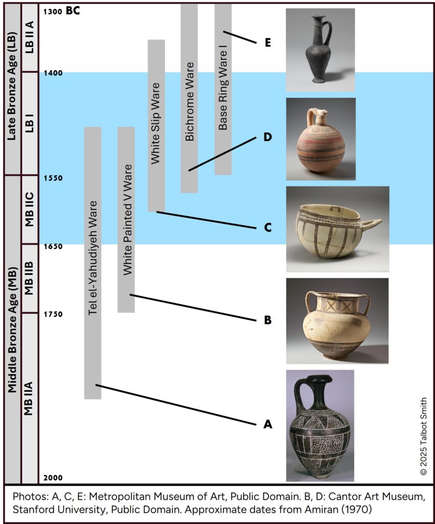 To understand this argument, it is necessary to understand a bit about pottery dating. Pottery styles change gradually over time, just as fashions do today, although much more slowly. Particular styles of pottery come and go, changing gradually over the lifetime of their production. Many styles bridge multiple archaeological periods, and in order to date a destruction layer, it is necessary to consider the entire collection, or assemblage, of pottery found. Figure 5 shows some of the significant types of pottery of the Middle and Late Bronze Ages. A date for the destruction of Khirbet el-Maqatir at the end of the Late Bronze I period (corresponding to Wood’s placement of the conquest in circa 1400 BC) would require the presence of Late Bronze forms such as White Slip Ware, and imported Cypriot Bichrome Ware and Base Ring Ware. However, Wood does not report findings of any of these pottery styles. It would also require the absence of older styles that faded out in the early LB I, such as Tell el-Yahudiyeh Ware and White Painted V Ware. As noted above, Wood has argued that the absence of Cypriot Bichrome ware in the City IV destruction layer at Jericho should not be used to argue that this site was destroyed in the Middle Bronze Age (i.e., before the advent of this pottery).[23] Bichrome Ware was imported from Cyprus, and would have appeared first on the coast and gradually worked its way inland. But this process would have likely been complete within a decade, whereas Wood’s argument requires that approximately one hundred and fifty years after this pottery first reached the shores of Canaan, it had still not made its way to Jericho. This argument is even weaker with respect to Ai, with its location in the central highlands, and weaker still with respect to Gibeon, on the road from the coast to the highlands, and which was “like one of the royal cities” (Joshua 10:2), and clearly affluent. Yet the same pottery was found in all three, and all three show an absence of bichrome ware in their destruction layers.